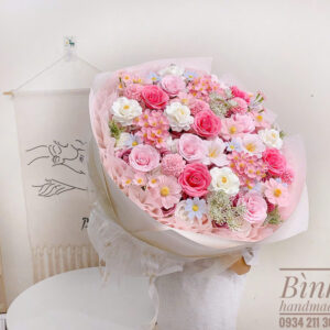 Mẫu hoa dưới đây là một trong những mẫu mới tại Bình handmade, sử dụng hoa hồng sáp loại 1, giấy gói chất lượng cao, được sắp xếp và bó tỉ mỉ, cẩn thận.